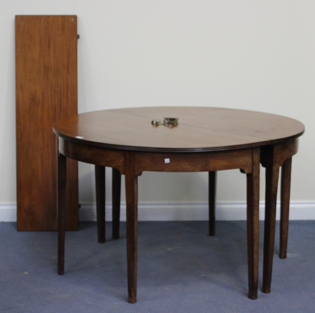 A George III mahogany 'D' end dining table fitted with a single extra leaf, raised on slightly tapering block legs, height approx 71cm, length approx 155cm, width approx 122cm.