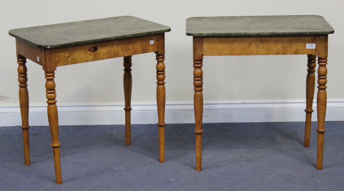 A pair of 19th Century satin birch rectangular occasional tables, each simulated marble top raised on turned tapering legs, height approx 61cm, width approx 62cm (alterations and restoration).