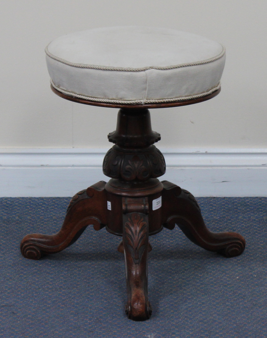 A Victorian walnut revolving piano stool with a carved knop stem and tripod cabriole legs.