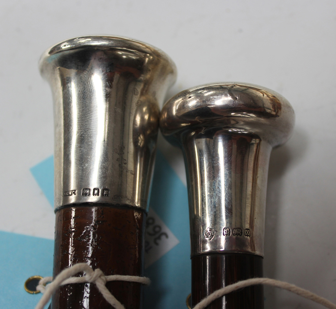 A George V silver mounted bamboo walking cane, Birmingham 1922 by J. Howell & Co Ltd, together with another silver mounted walking cane, London 1922, length approx 94cm.