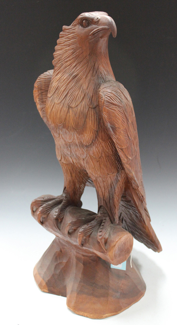 A carved softwood model of an eagle, supported on a perch type base, height approx 60cm.