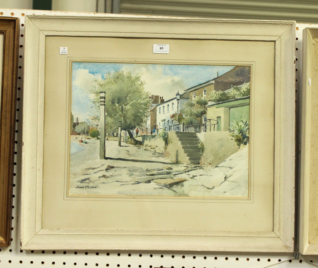 Frank C. Belcher - Horses and Figures on a River Bank, possibly Chiswick Mall, watercolour, signed, approx 31cm x 42cm, together with two oils on canvas by the same hand.