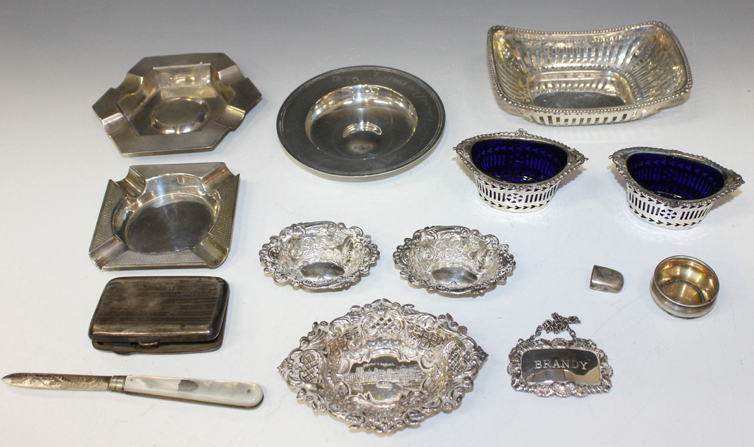 A pair of Edwardian silver oval mustards with pierced sides, Sheffield 1905 by Walker & Hall, a sterling silver souvenir dish, the centre decorated with a titled scene of 'Montreal' within pierced and embossed sides, a George V silver rectangular bonbon dish with pierced sides and beaded rim, Birmingham 1912, and a collection of other silver items.