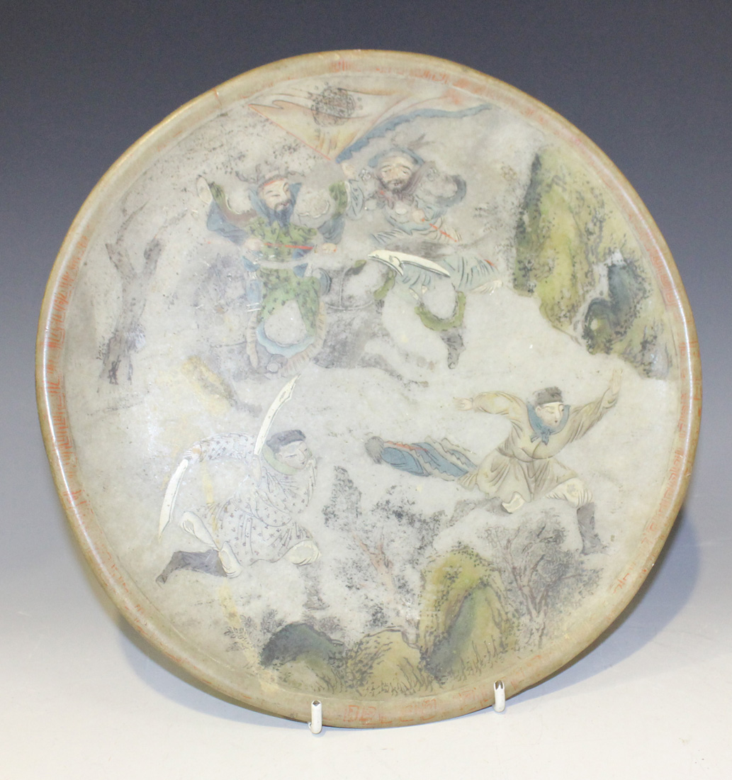 A Chinese alabaster circular plate, late Qing dynasty, painted with a warrior on horseback and his flagman attendant chasing two swordsmen on foot, within a red key fret rim, diameter approx 28cm.