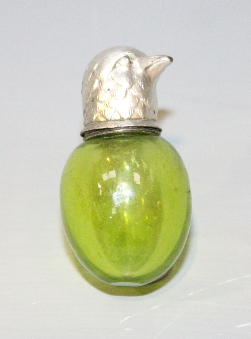 A plated and green glass novelty scent phial, the screw cover in the form of a chick's head, above a green glass egg shaped body, length approx 4cm (minor damage to neck).