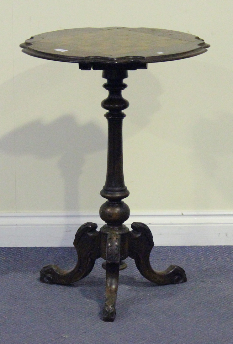 A Victorian walnut games table, the shaped top inlaid with a chess board, raised on a turned stem and carved tripod legs, height approx 74cm (restoration).