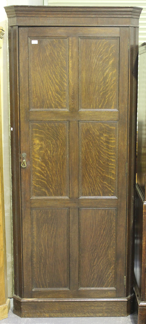 An George V oak corner cupboard, fitted with a panel door, on a plinth base, height approx 214cm, width approx 84cm.