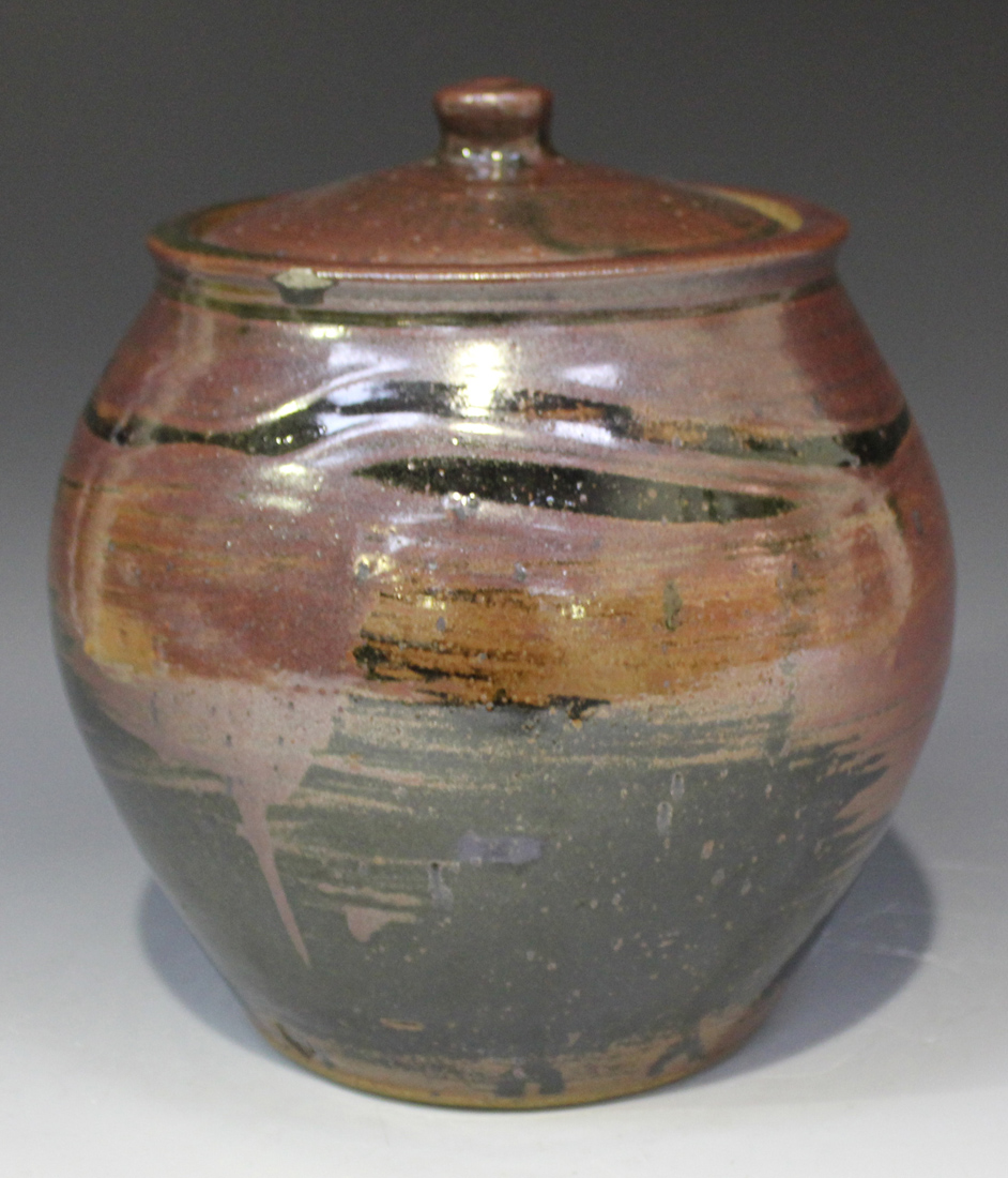 A Terry Bell-Hughes studio stoneware jar and cover, covered in a tenmoku glaze, impressed artists mark near base, height approx 25cm (faults).