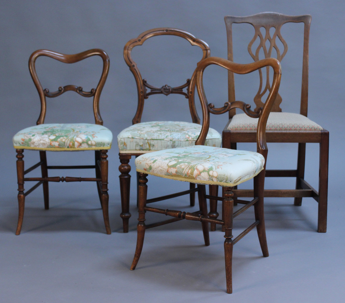 A pair of mid-Victorian walnut spoon back bedroom chairs, a similar bedroom chair and a George III style splat back chair.