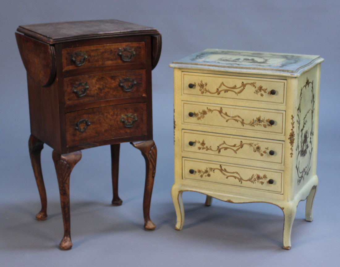 A late 20th Century Louis XV style yellow painted bedside chest of four drawers, on cabriole legs, height approx 65cm, width approx 49cm (faults), together with a 20th Century walnut drop-flap bedside chest.