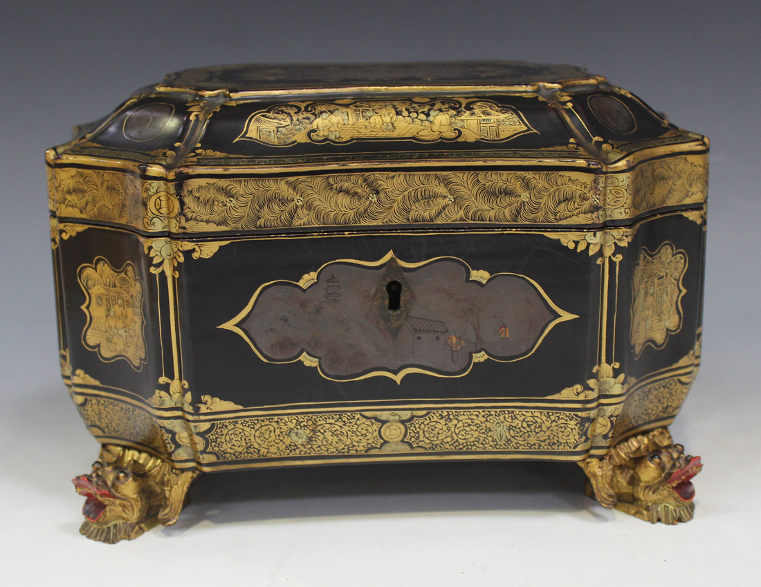 A Chinese export lacquer tea caddy, early 19th Century, the exterior gilt with figural and landscape panels on a black ground, the hinge lid revealing two fitted pewter canisters and covers, raised on giltwood dragon mask feet, length approx 22cm (small chip to foot and repair).