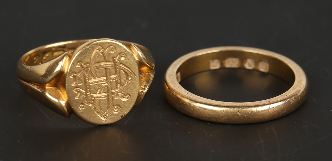 An 18ct gold oval signet ring, monogram engraved, Chester 1913, ring size approx M, and an 18ct gold plain wedding ring, ring size approx L.