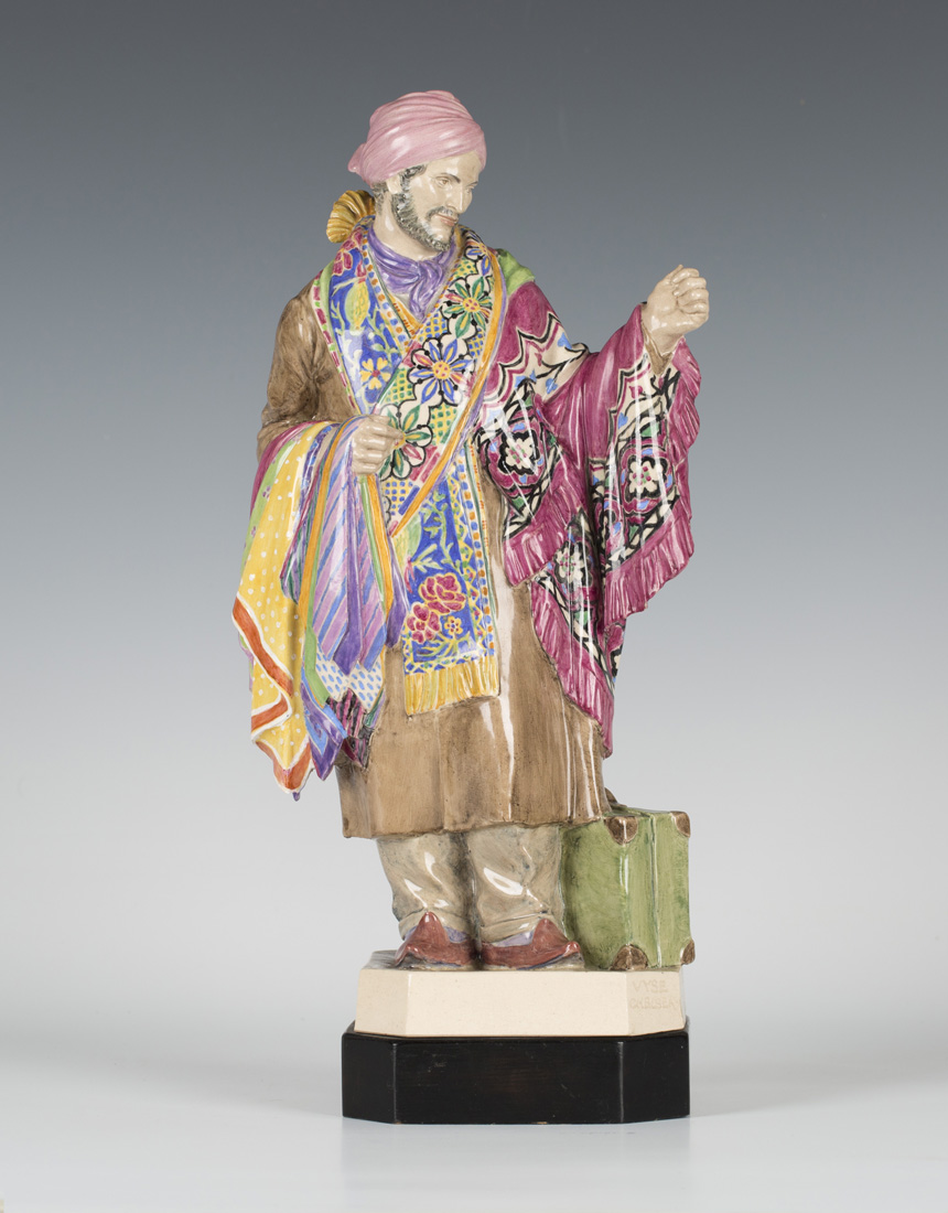 A Charles Vyse pottery figure of In Petticoat Lane, introduced in 1938, modelled as a standing Arab wearing a pink turban and long brown coat, carrying colourful ties, scarves and shawls in his arms, with suitcase at his feet, on an octagonal paved flagstone base, incised 'Vyse Chelsea' to side of base, height approx 33cm. Note: this figure has an alternative title of The Pedestrian Bazaar.