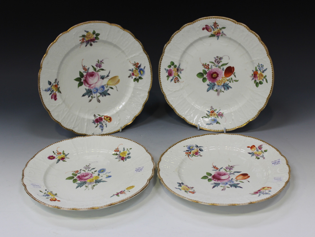 A set of four porcelain plates, circa 1820, possibly Davenport, each painted with flower sprays within a moulded rim with gilt dentil edge, impressed anchor factory mark to bases, diameter approx 24.5cm.