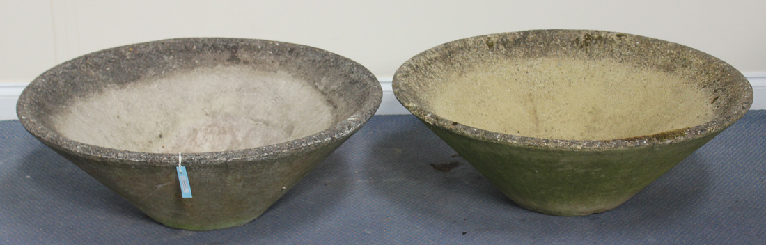 A near pair of 20th Century cast concrete garden planters of shallow conical form, height approx 32cm, diameter approx 89cm.