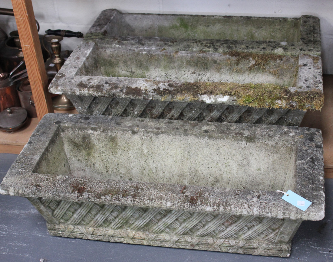 A pair of 20th Century cast composition stone Belton pattern garden wall troughs, similar to a design by Haddonstone, width approx 87cm, together with a similar trough.