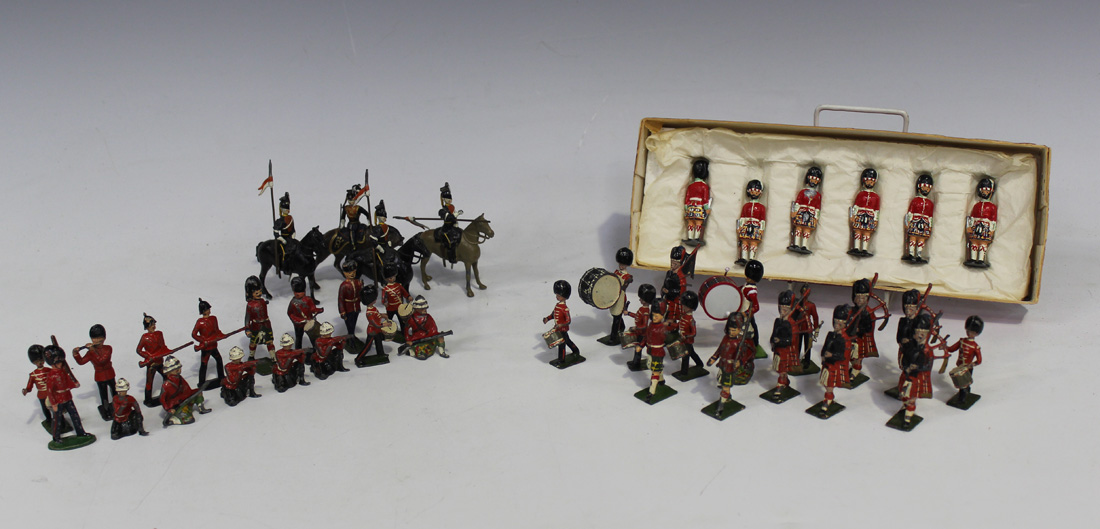 A collection of Britains and other lead soldiers, including lancers and Highland bandsmen (playwear, paint chips and faults).