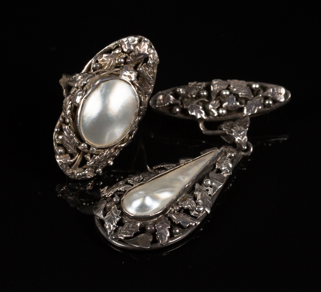 An Arts and Crafts silver and blister pearl pendant brooch, the drop shaped pendant mounted with a blister pearl in a pierced and cast acorn and oak leaf surround, suspended from a similarly decorated oval brooch fitting, length approx 5.5cm, together with a matching ring, ring size approx O1/2.