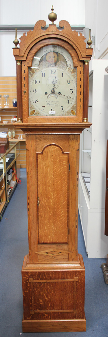 A George III and later oak longcase clock with eight day movement striking on a bell, the painted break arch dial with rolling moon to arch above Arabic numerals, subsidiary seconds, date aperture and inscribed 'Richd Alexander Chippenham', the later case with chequer banding, on a plinth base, height approx 223cm, with pendulum, two weights and winding key.