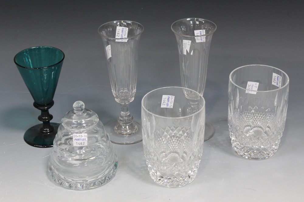 A Bristol green wine glass, early 19th Century, with conical bowl and bladed knop stem on a circular foot, height approx 13cm, together with two cut glass champagne flutes, early 19th Century, each on a circular foot, two Waterford crystal tumblers and a glass honeypot of skep form.