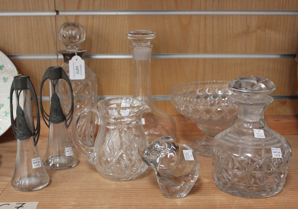 A cut glass decanter and stopper with silver collar, Birmingham 1973 by J.B. Chatterley & Sons Ltd, an Orrefors clear glass decanter and stopper, a pair of Secessionist pewter mounted clear cut glass vases and a small collection of glassware.