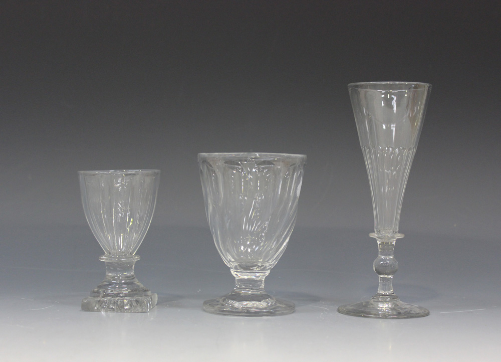 A bonnet glass, early 19th Century, the vertically ribbed rounded funnel bowl on a lemon squeezer square base, height approx 9.5cm, together with a champagne flute and a spiral cut wine glass.