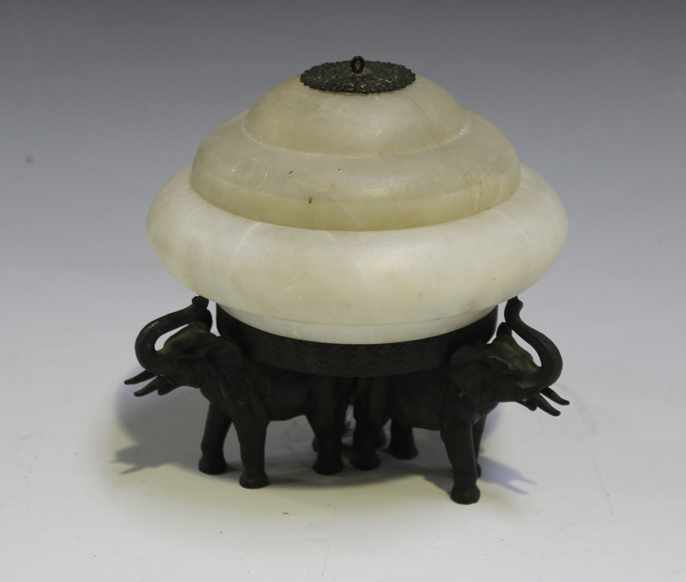 An early 20th Century French brown patinated cast metal and alabaster jar and cover, the circular alabaster body raised on three elephant supports, height approx 14cm (crack to lid).