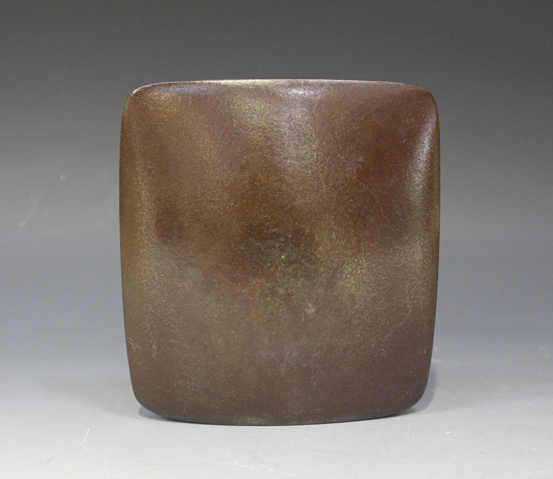 A Japanese gilt speckled brown patinated bronze vase, early 20th Century, of slightly swollen rectangular form, height approx 14.5cm.