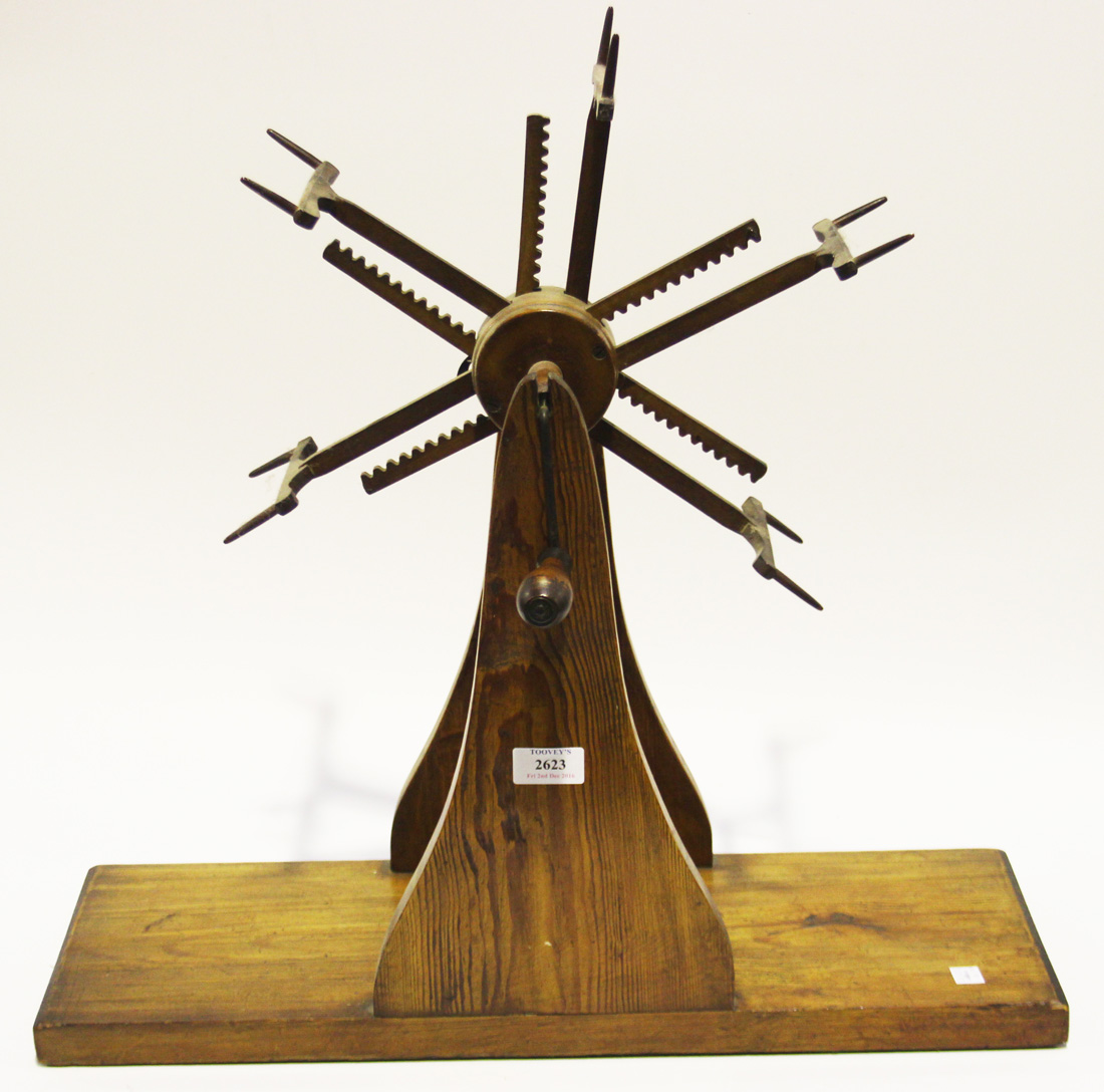An early 20th Century pine wool winder with a winding handle and rectangular base, height approx 57cm, width approx 57cm.