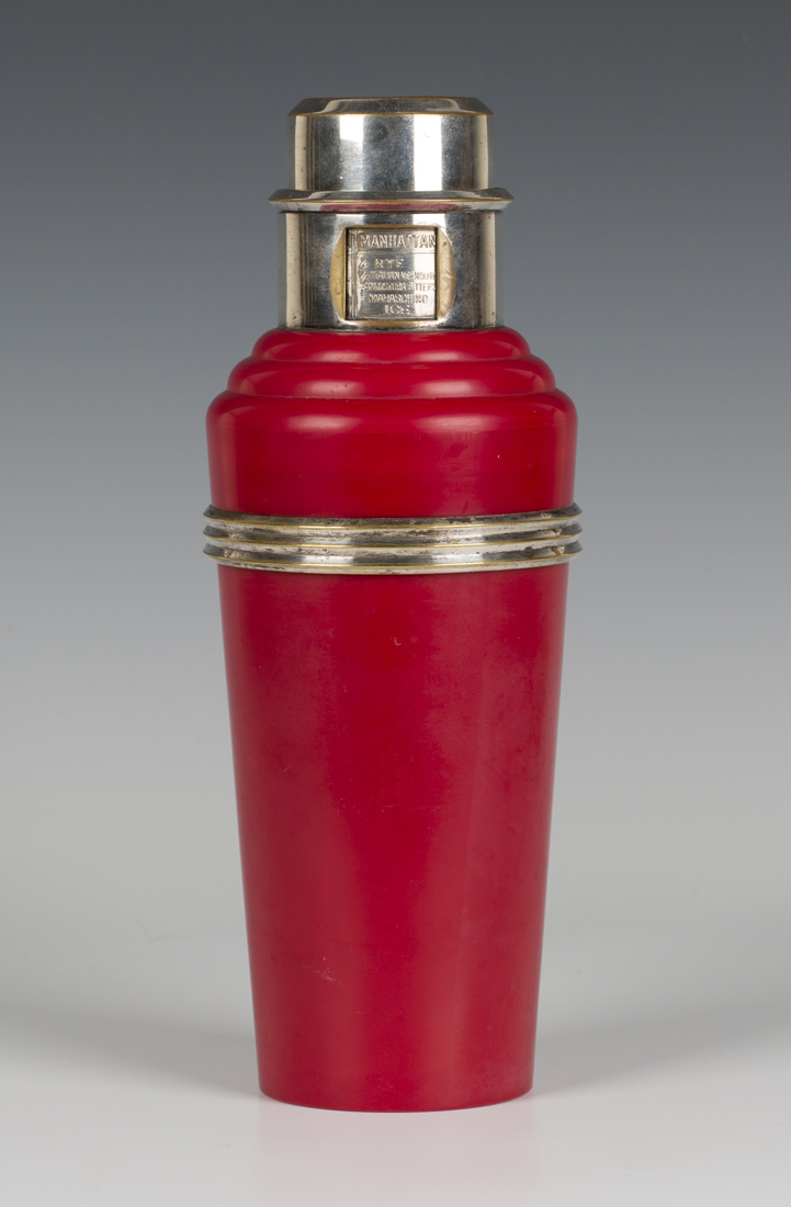 A mid-20th Century Incolor red plastic and chromium plated cocktail shaker, the revolving top with rotating recipe aperture, the underside marked 'The Master Incolor Cocktail Shaker', height approx 28cm.