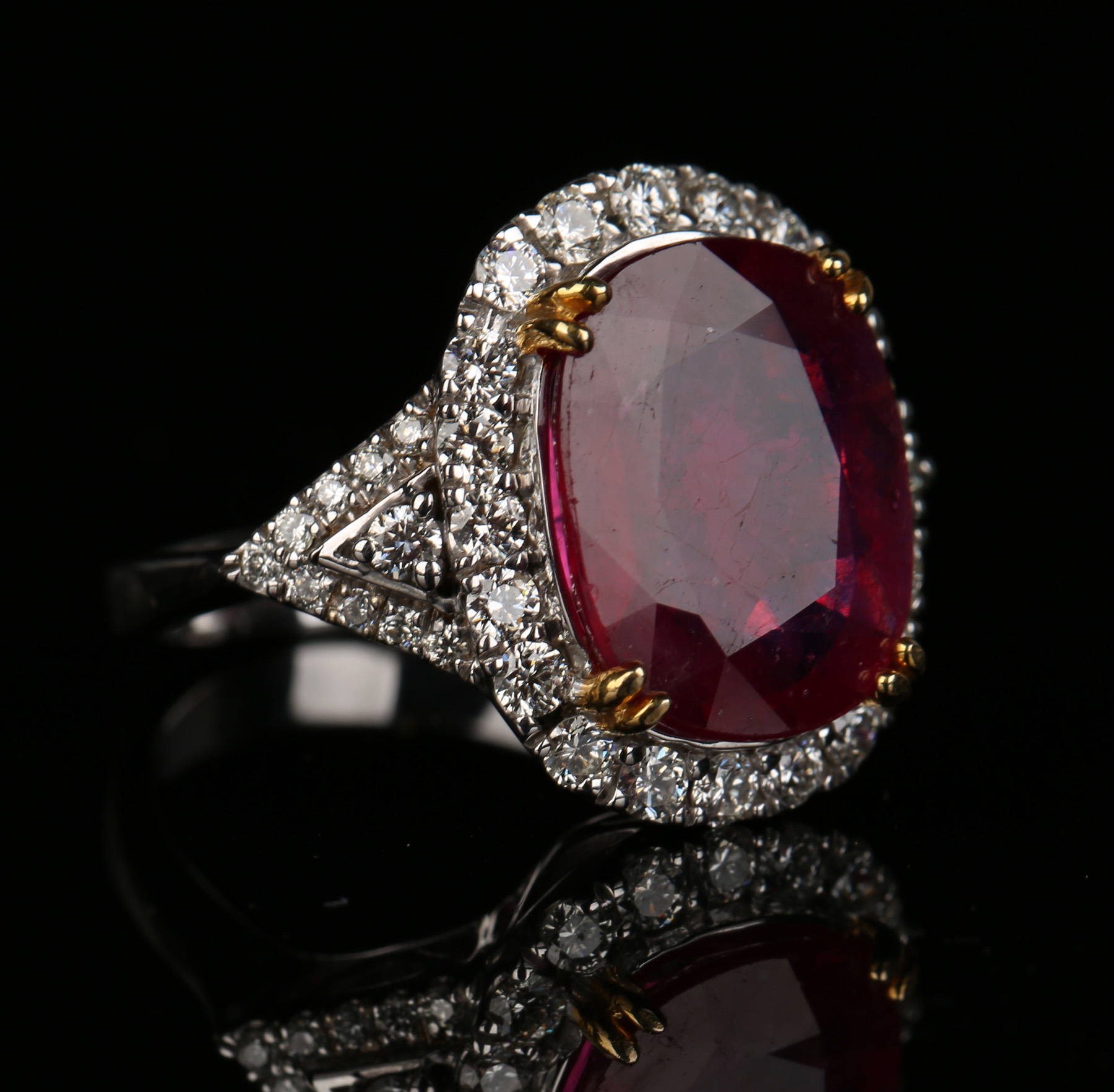 An 18ct white gold, ruby and diamond ring, claw set with an oval cut ruby within a surround of circular cut diamonds between diamond set triangular shoulders, detailed '750', ring size approx M1/2, total diamond weight approx 0.90ct, ruby weight approx 6.25ct.