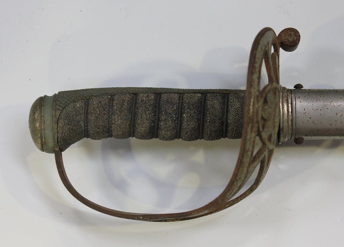 A Victorian Scots Guards levee sword by Cater & Co with straight dumbbell section blade, length 82.5cm, etched with battle honours to Suakin 1885, nickel plated regimental hilt, wire bound fishskin covered grip (plating worn, some rusting), with its nickel plated steel scabbard (some rusting), together with a tourist quality kukri with sheaths.
