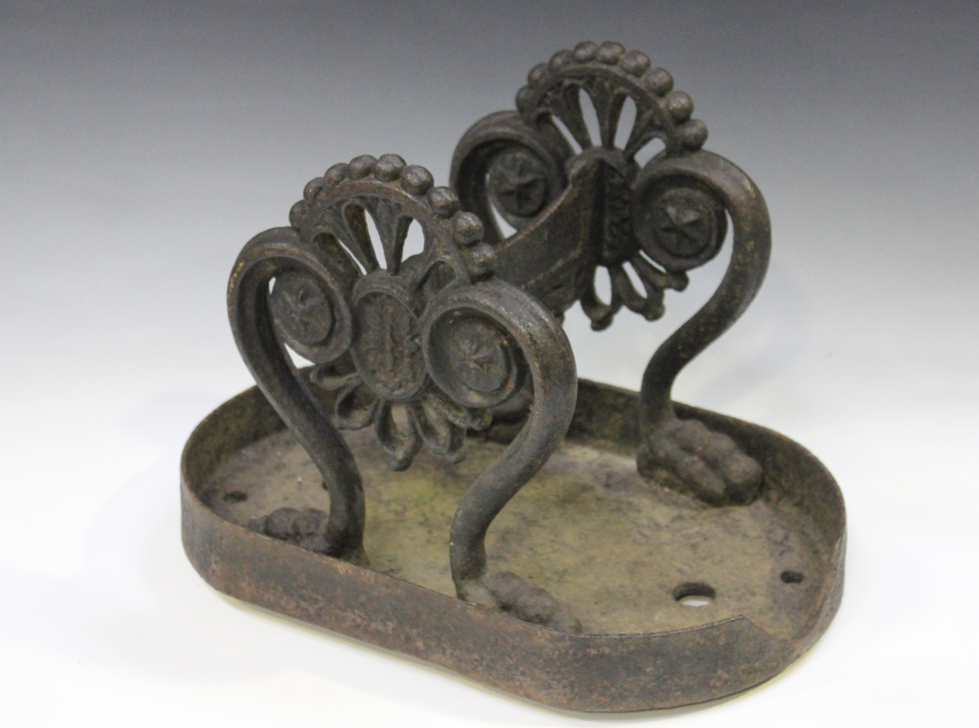 A mid-19th century cast iron boot scraper, possibly by Coalbrookdale, the pierced scrape raised on a pair of scrolling supports, cast with rosettes and pierced roundels, raised on a curved dish base, width 40cm (faults). Provenance: from the estate of the late Alistair Morris.