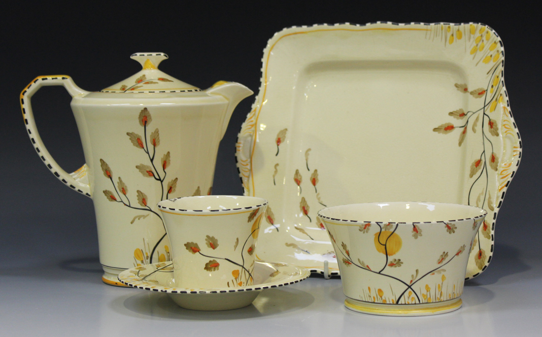 A Crown Devon Fieldings Modone shape part service, circa 1930s, each decorated with autumnal leaves, flowers and golden sun, comprising coffee pot and cover, teapot, cover and stand, four cups and six saucers, six side plates, cake plate, cake stand, milk jug and sugar bowl, printed factory mark and painted pattern number 'A269' to bases (hairline crack to milk jug).