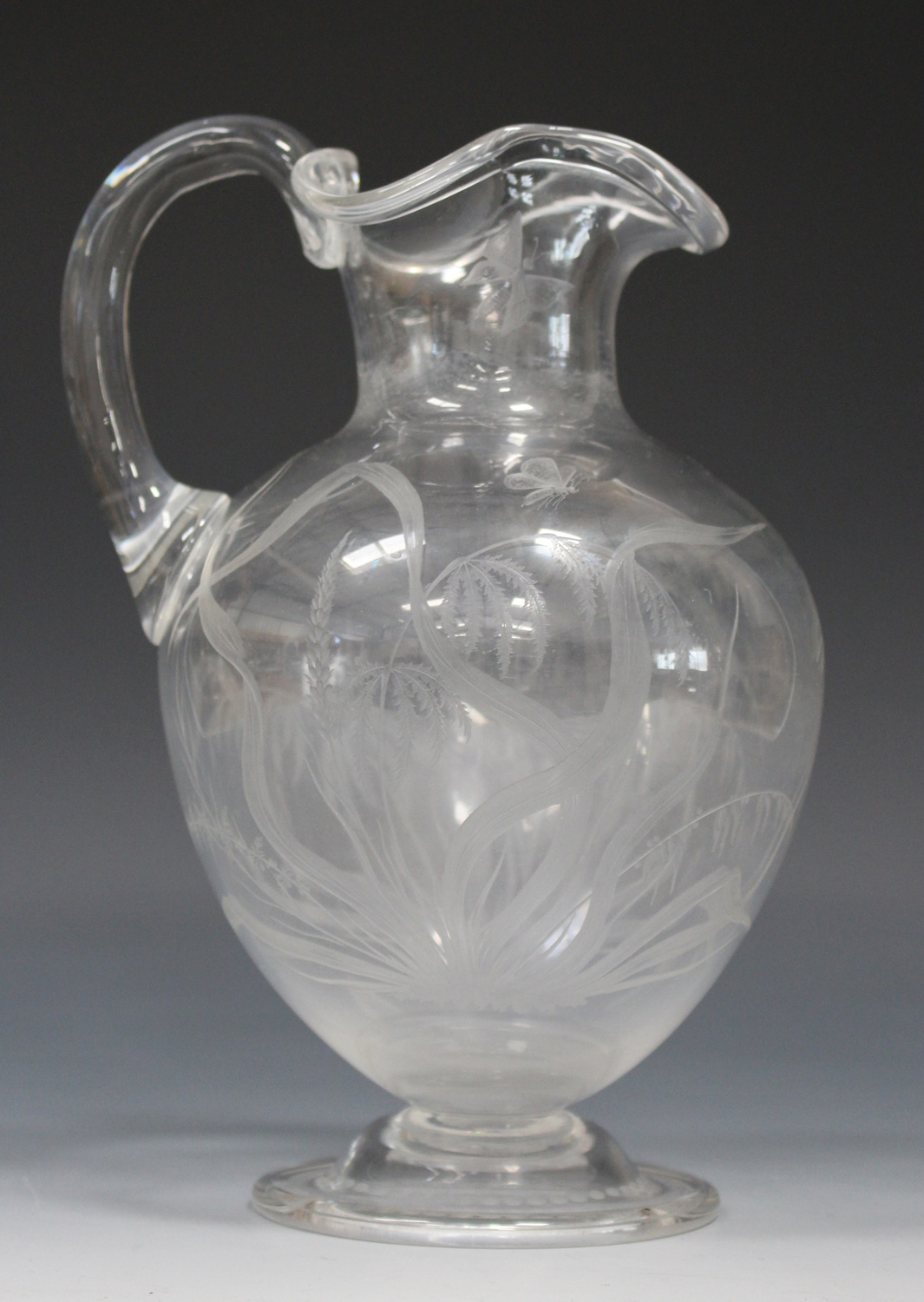 A Stourbridge glass jug, late 19th century, the ovoid body engraved with butterflies above grasses, beneath a pinched trefoil rim and loop handle on a circular foot, height 24cm.