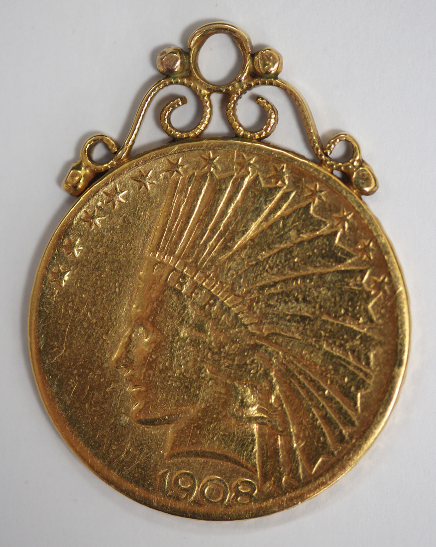 A U.S.A. ten dollars 1908, mounted as a pendant.