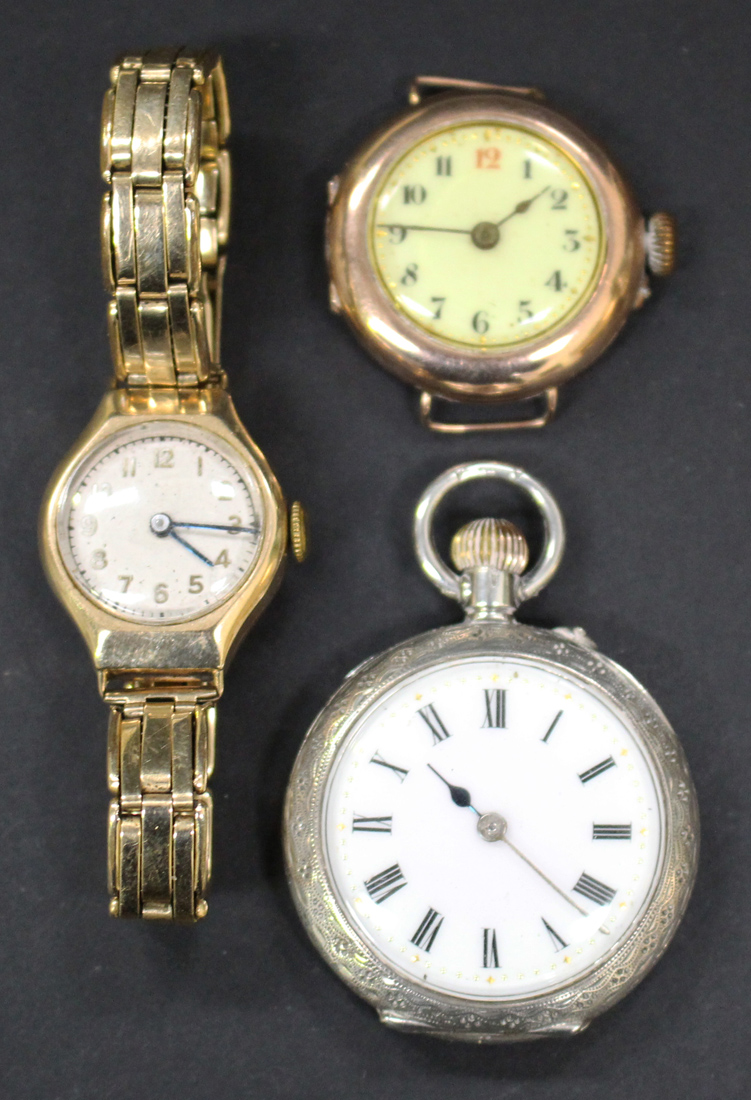 A 9ct gold oval cased lady's wristwatch, the signed circular silvered dial with Arabic numerals, on a gold sprung link bracelet, the clasp detailed '9ct metal core', case width 2cm, a 9ct gold circular cased lady's wristwatch, import mark Birmingham 1915, and a silver cased keyless wind open-faced lady's fob watch with a cylinder movement, detailed '0,935'.