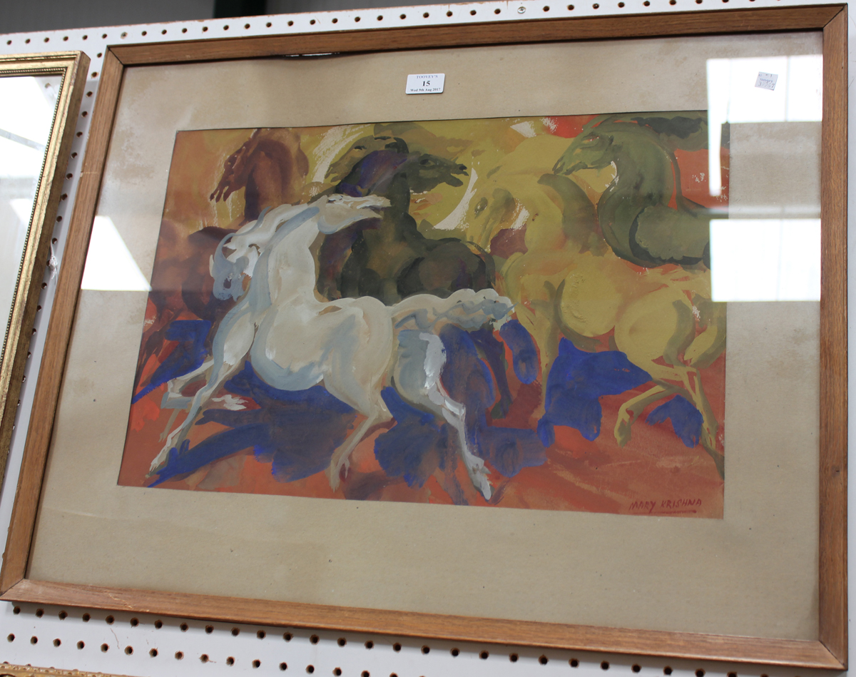 Mary Krishna - 'The Yellow Horse', watercolour and acrylic, signed recto, titled to label verso, 37cm x 55.5cm, within a stained wood frame.