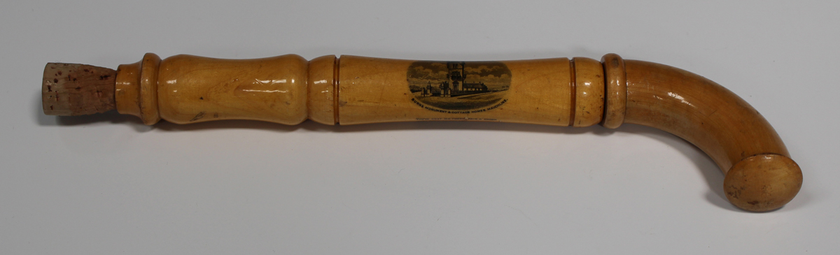 A 19th century Mauchline ware pop-gun, transfer decorated with a titled scene of 'Burns Monument & Cottage Homes, Mauchline' above a verse, length 31cm.