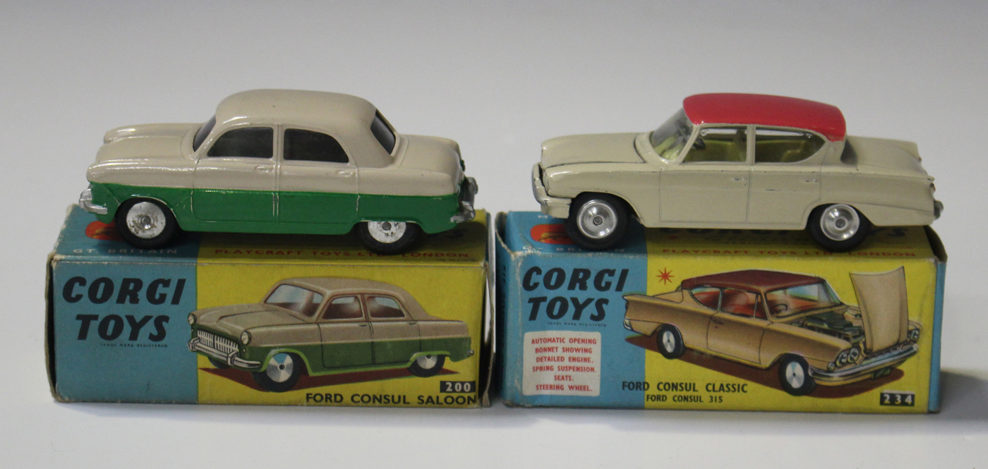 A Corgi Toys No. 200 Ford Consul saloon, finished in green and beige, and a No. 234 Ford Consul Classic, finished in beige with pink roof, both boxed (boxes creased and scuffed).