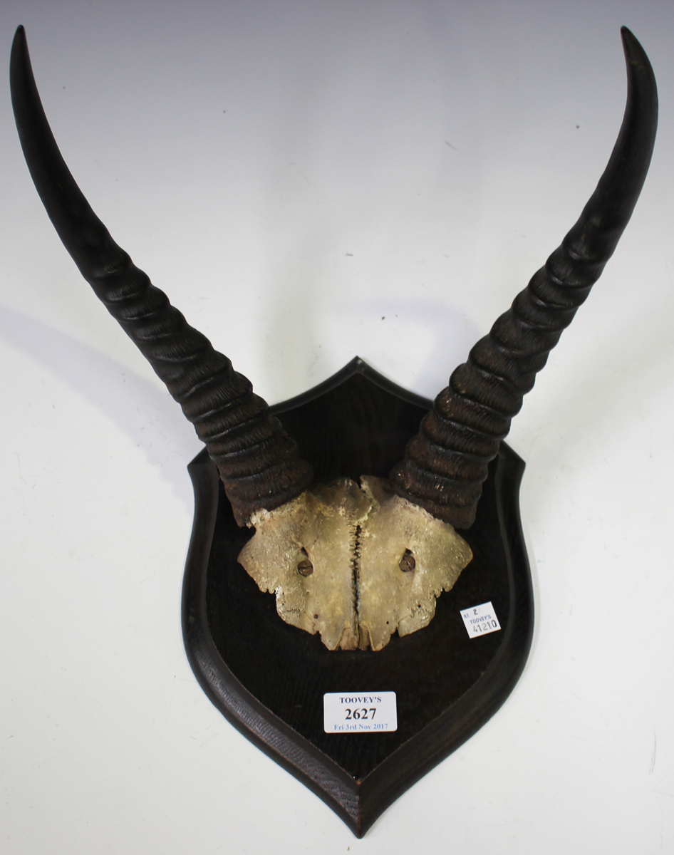 An early/mid-20th century mounted antelope skull cap and horns, the oak shield plate bearing label marked 'The Jungle, Trade Mark, Rowland Ward ... London', height 33cm.