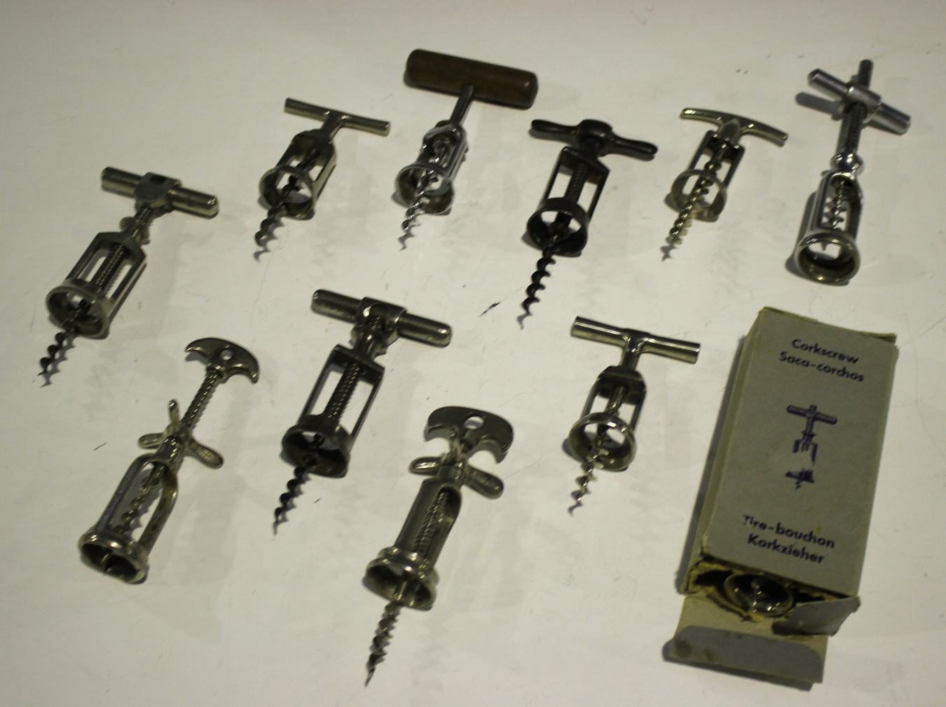 A group of eleven open barrel corkscrews, including a J. Perille Helice, a Monopol, another marked 'The Challenge' and a boxed Tire-bouchon.