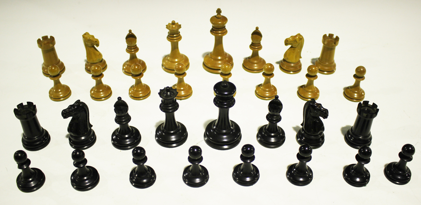 An early 20th century ebony and boxwood Staunton chess set by Jaques & Son, London, bearing maker's marks, height of king 9cm, within original walnut box with applied paper label to lid.