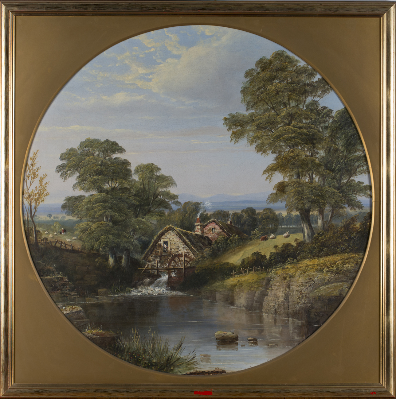 Samuel Parrott of Nottingham - Tondo Landscape with Watermill, 19th century oil on canvas, signed, diameter 73cm, within a gilt frame.