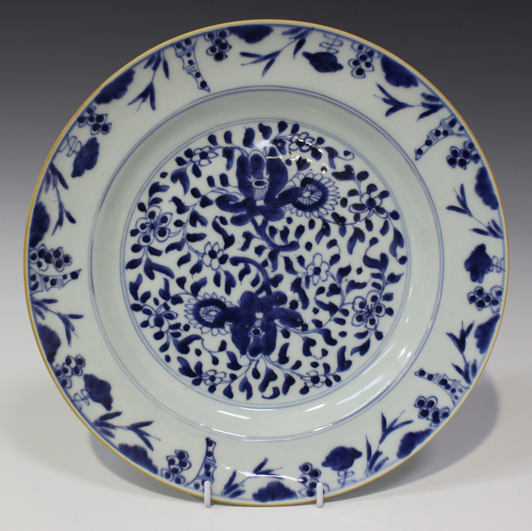 A Chinese blue and white export porcelain circular dish, Kangxi period, the centre painted with flowers and scrolling foliage, within a bamboo and vine rim, diameter 28cm.