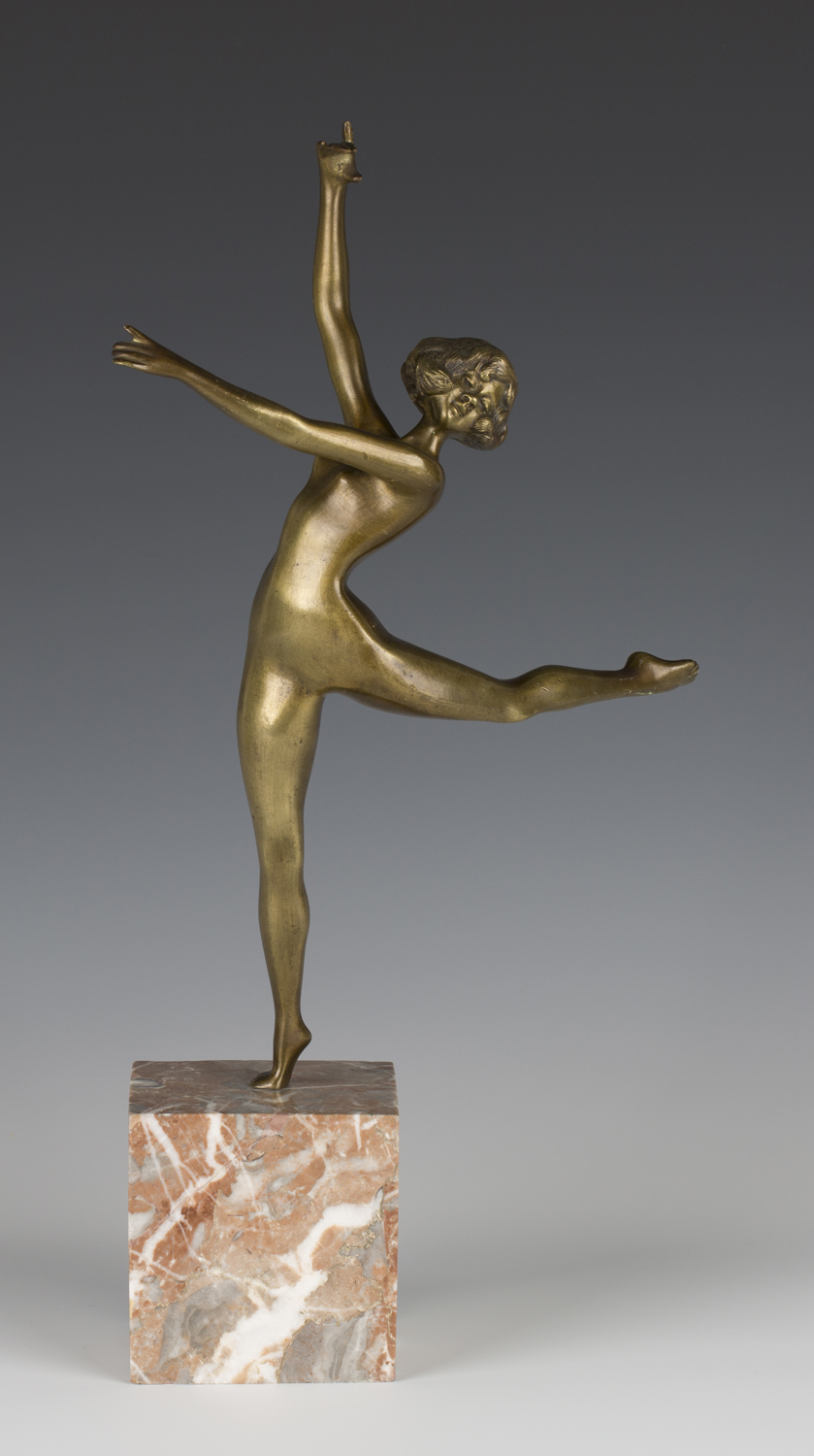 An Art Deco period gilt cast bronze figure of a nude female dancer, in the manner of Josef Lorenzl, raised on a marble block base, height 38cm.