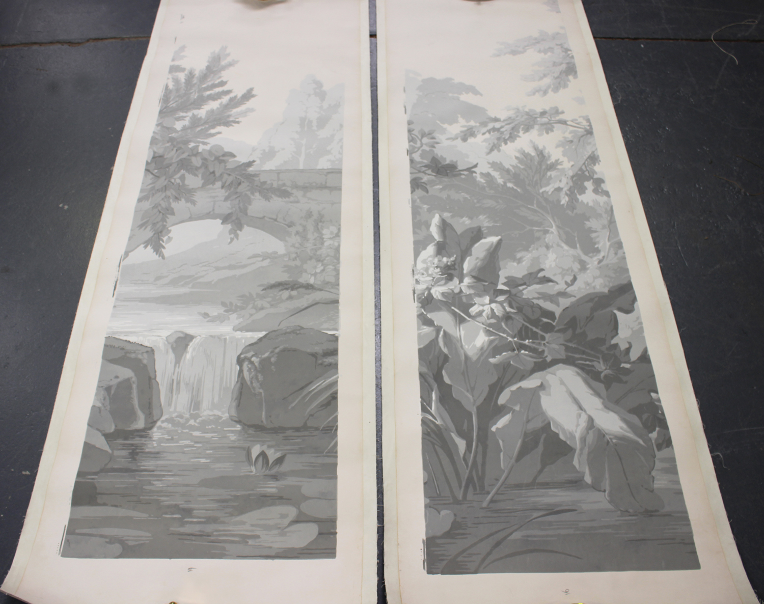A set of five late 19th/early 20th century French grisaille printed wallpaper sections, depicting riverside scenes of flora and fauna, width 57cm, length 297cm, later laid onto canvas, together with two late 19th century German chromolithographed ornithological prints. Provenance: from the estate of the late Nellie Lenson-Smith (1928-2017).