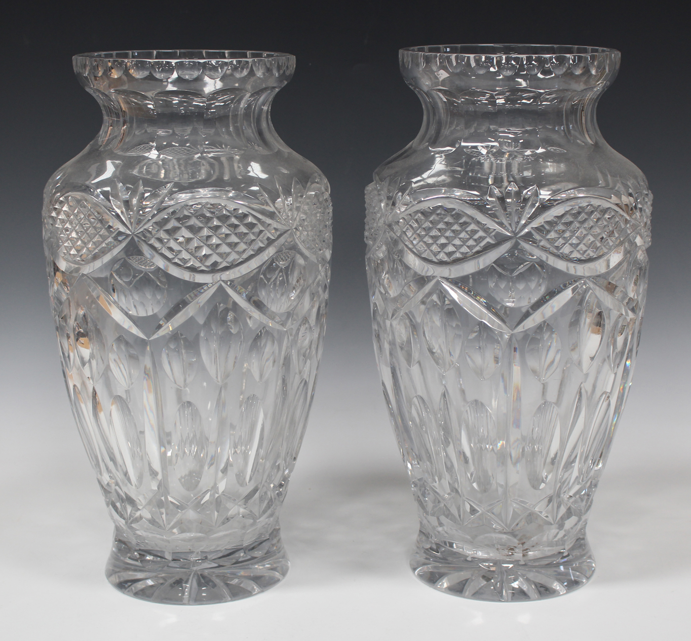 A pair of large cut glass vases, modern, with slice and hobnail decoration, height 39cm.