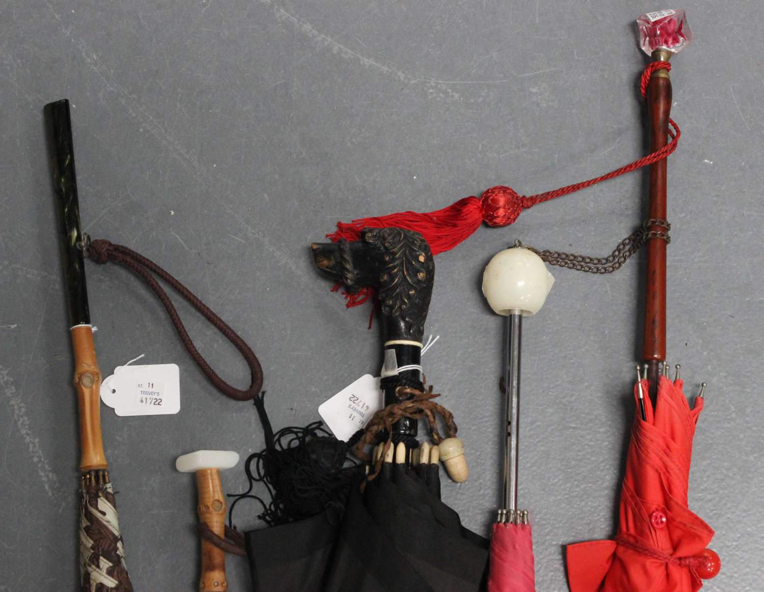 An early 20th century black silk parasol, the carved softwood handle modelled in the form of a dog's head with inset glass eyes, length 68cm, together with a group of four mid-20th century ladies' parasols.