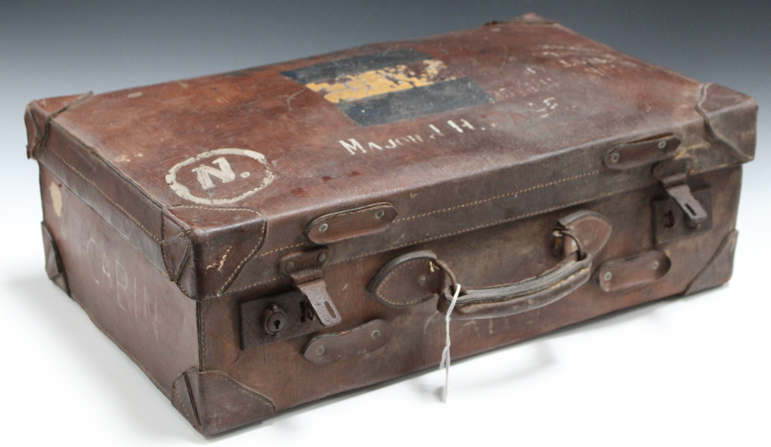 An early 20th century brown leather suitcase, the lid inscribed 'Major J.H. Page', width 61cm.